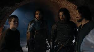Whislt D'Artagnan (Luke Pasqualino) and Athos are happy to see him, Porthos (Howard Charles) holds a grudge cos Aramis wasn't there to watch his back and really isn't in the hugging mood. They devise a plan to wait until dark and get the children out. As night falls, they lead the children out, The Great Escape style by getting them to follow a rope even though the monastery is surrounded. As Porthos and Aramis are left to take the wagon out after they fight the men at the monastery and also free the other monks. They explode the wagon and the Spanish flee. Athos also having recognized Grimaud as the man he saw on the battlefield.